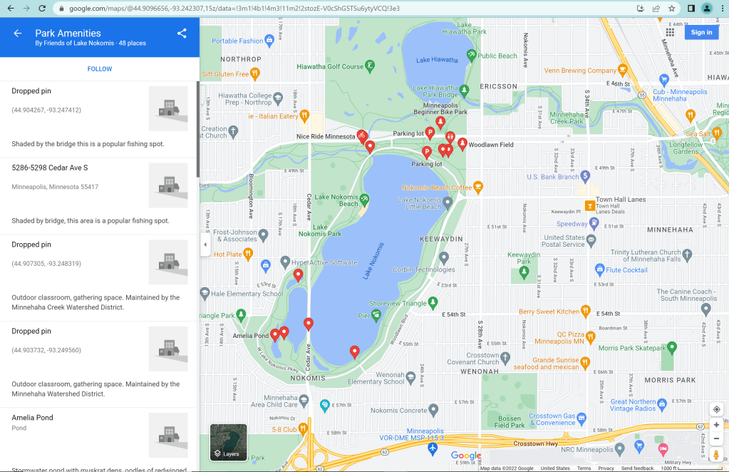 In 1996, the park board attempted to recreate a portion of the lost wetland system with the creation of an 8 acre marsh on the southwest bay of the lake. This marsh was expanded and modified to include a settling pond and grit chamber in 2001 along with the creation of two additional marshes containing settling ponds and grit chambers in the same year. An inflatable weir to prevent Minnehaha Creek from overflowing into Lake Nokomis during periods of high water was installed in 2002, and replaced with an adjustable weir in 2012. The most recent modifications to the park have been the extensive shoreline restoration occuring primarily around the Additional historical narrative about the lake can be found in the SE end of the lake. You can learn more abou this and other city parks in the Minneapolis Park and Recreation Board publication: Parks, Lakes Trails and So Much More.